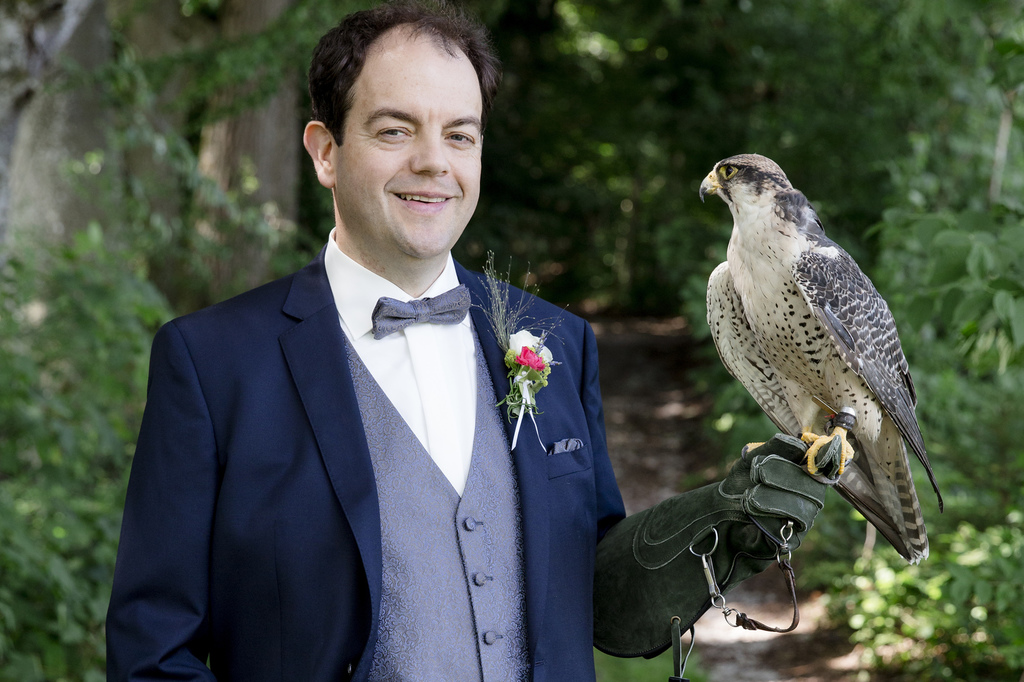 Hochzeitsfotos mit Falken sind auch ein schönes Hochzeitsgeschenk. Mit Hilfe eines Falkners können sie sich mit Falken oder Uhu auf der Hand im Hochzeitsbild in Szene setzen lassen, oder sie buchen das Brautpaarshooting gleich bei uns mit.